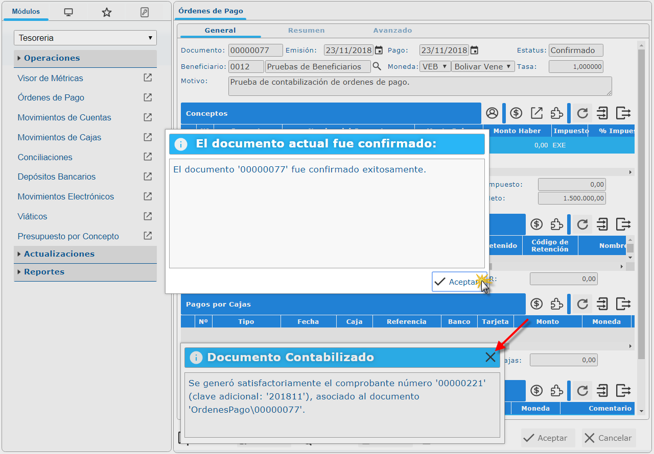 , se nos muestras dos ventana: " El Documento Actual fue Confirmado y Documento contabilizado."