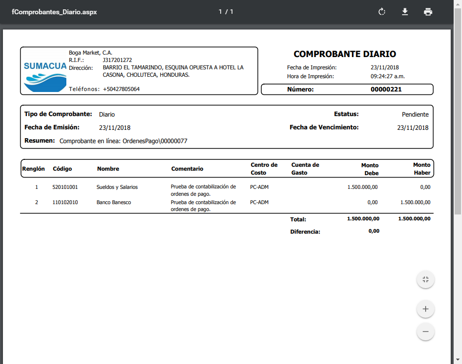 b. Donde Observaremos el comprobante Diario de la orden de pago generada.
