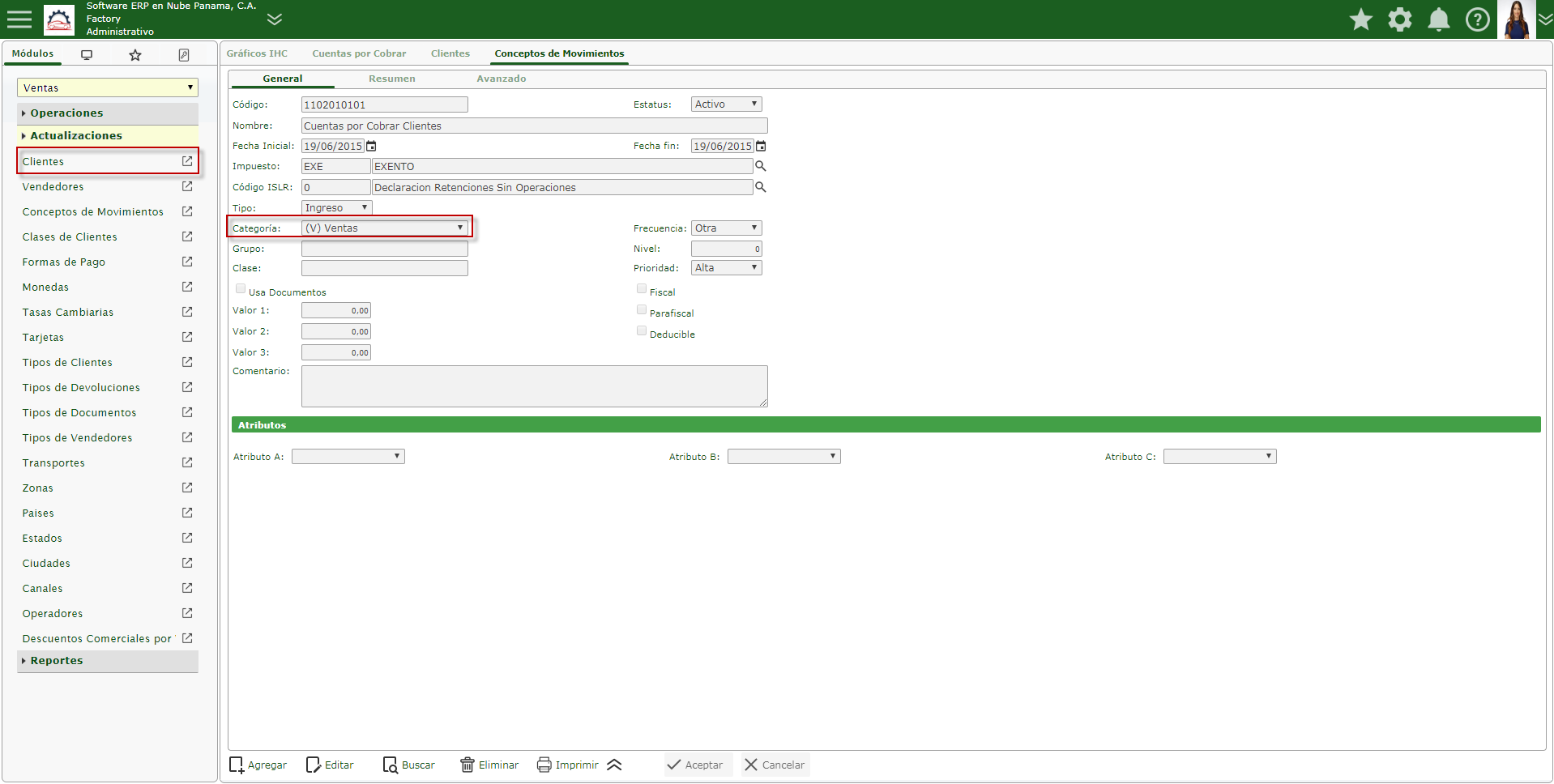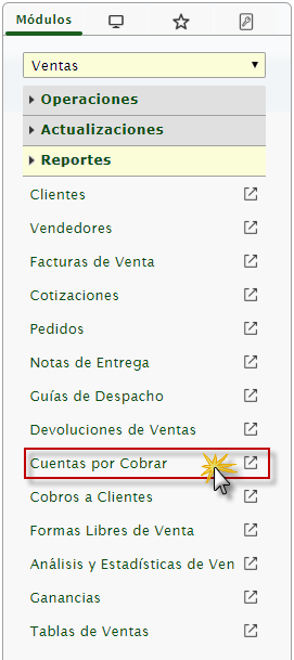 b. Después seleccionaremos el módulo Ventas, desplegamos el componente Reportes y activamos el sub componente Cuentas por Cobrar.