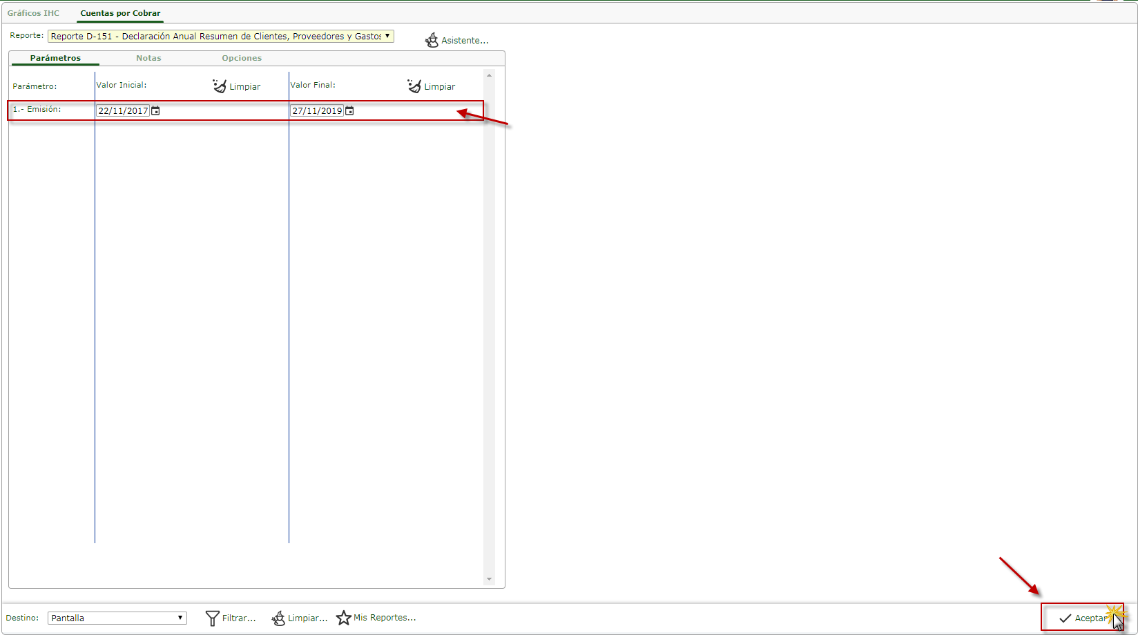 a. Se muestra la ventana de Reportes de Cuentas por Cobrar y nos ubicamos en la parte superior en el campo Reporte y se desplegara un panel en el cual debemos seleccionar Reporte D-151 Declaración Anual Resumen de Clientes, Proveedores y Gastos Específicos (CRI).