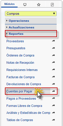 b. En el módulo Compras, desplegamos el componente Reportes, activamos el sub componente Cuentas por Pagar.