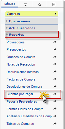 b. En el módulo Compras, desplegamos el componente Reportes, activamos el sub componente Cuentas por Pagar