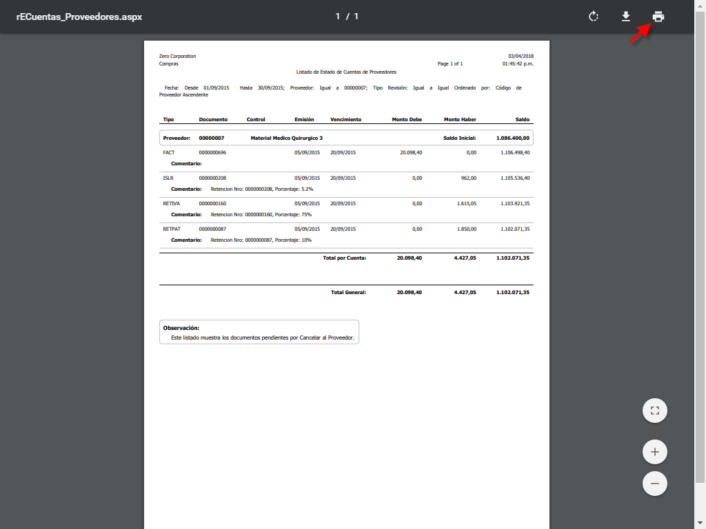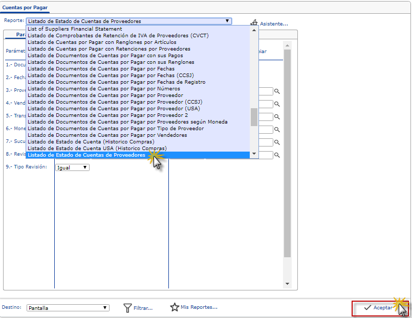 Listado de Estado de Cuentas de Proveedores, especificamos los parámetros necesarios y presionamos el botón