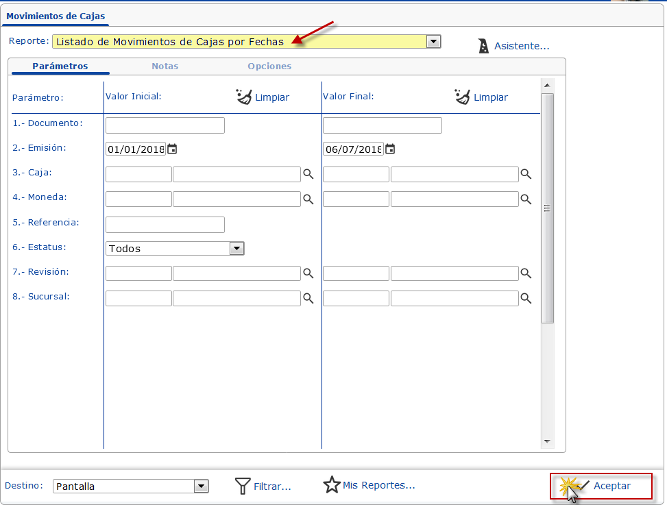 Listado de Movimientos de Cajas por Fechas, especificamos los parámetros necesarios y presionamos el botón