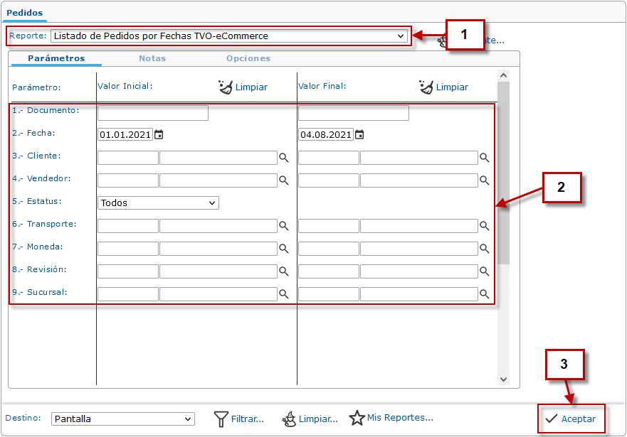 b. Luego de haber seleccionado el reporte Listado de Pedidos por Fechas TVO-eCommerce debe ingresar las fechas a consultar junto con los filtros que necesite y por último presione el botón