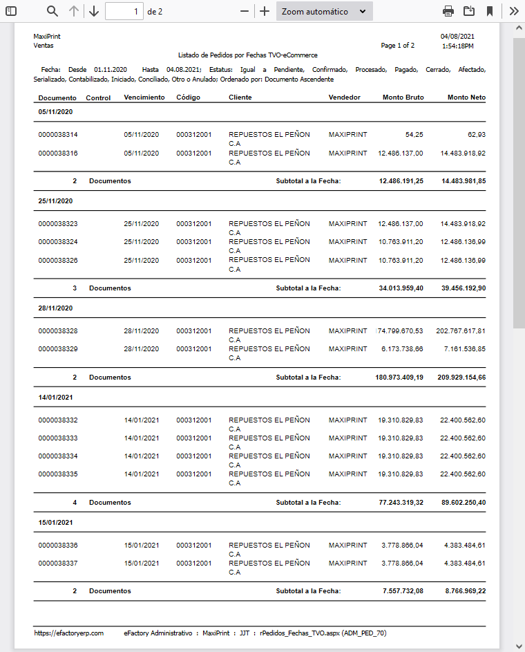 se emitirá el reporte Listado de Pedidos por Fechas TVO-eCommerce.