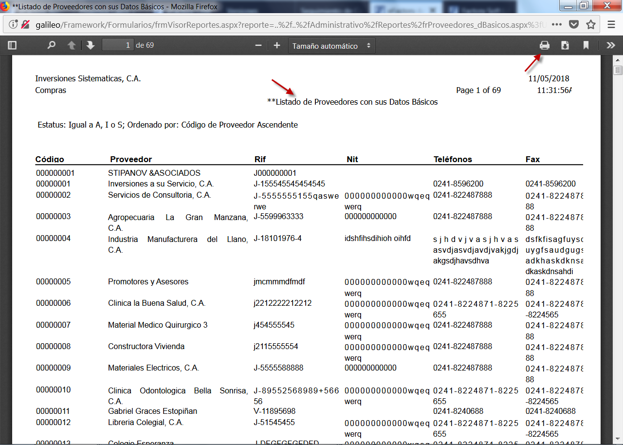 b. Luego de aceptar los Parámetros, se muestra en pantalla el Listado de Proveedores con sus Datos Básicos, en el cual vemos información propia del cliente como Rif, Nit, Teléfono y Fax; aquí debemos verificar la información y procedemos a guardar el documento como pdf o bien imprimirlo.