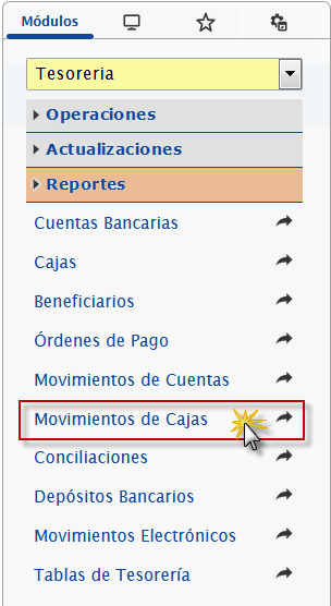 b. En el módulo Tesorería, desplegamos el componente Reportes y activamos el sub componente Movimientos de Cajas