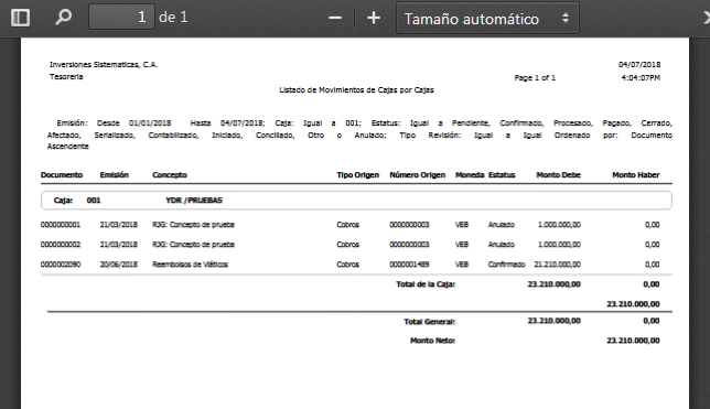 b. Luego de aceptar los parámetros, se muestra en pantalla el Listado de Movimientos de Cajas por Cajas, el cual debemos verificar y procedemos a guardarlo como un documento PDF o bien imprimirlo