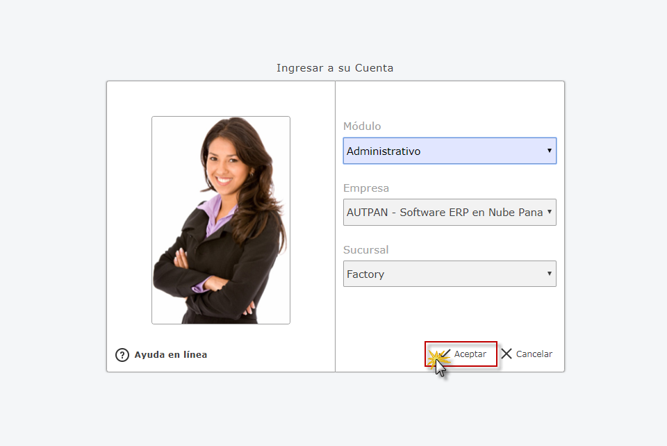 a. Para ingresar a eFactory, debemos colocar Código de Usuario y Contraseña, luego presionaremos el botón Iniciar Sección y seleccionaremos el módulo Administrativo,