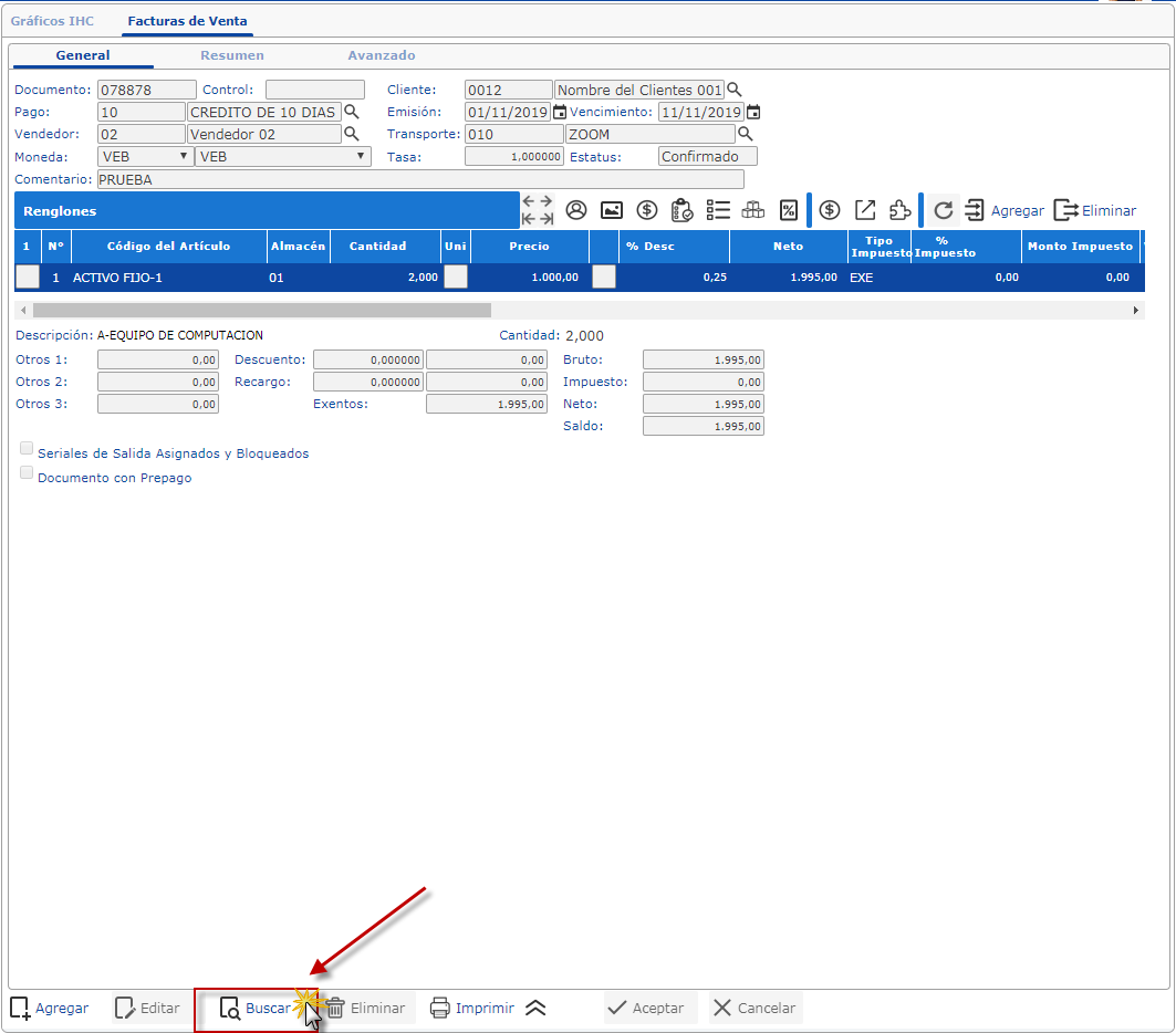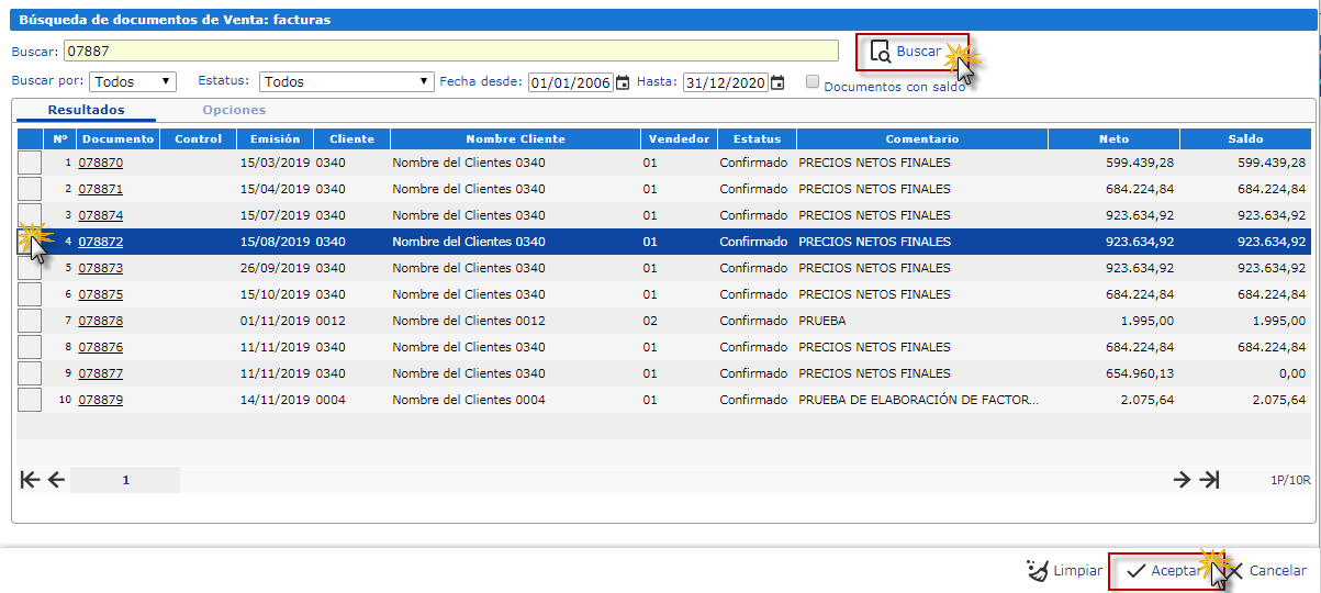 b. Al seleccionar Buscar, buscaremos el documento de venta a enviar por correo electrónico. En el campo buscar colocamos el código del documento y presionaremos el botón