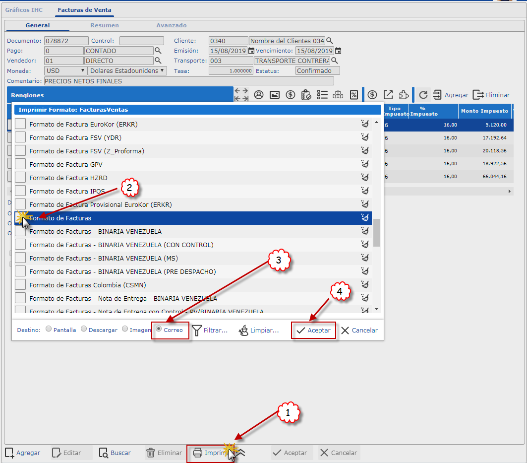 Lo que hacemos es ubicarnos en la parte inferior de la ventana en el campo Destino y marcar donde dice Correo luego procedemos a marcar el formato y presionar el botón