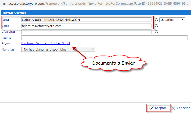 b. Después podemos observar la ventana de Enviar Correo donde verificamos los datos y el documento a enviar, luego para finalizar presionaremos el botón