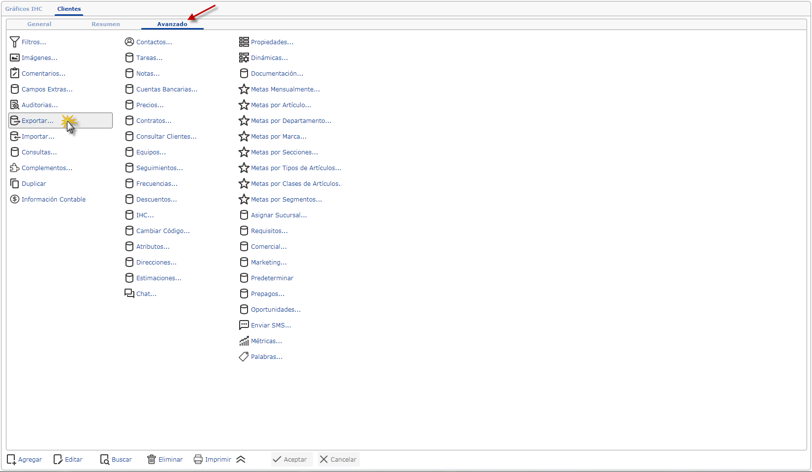 a. Al haber seleccionado el sub. componente Clientes, se muestra la pantalla donde nos ubicamos en la parte superior y seleccionaremos la ficha Avanzado.