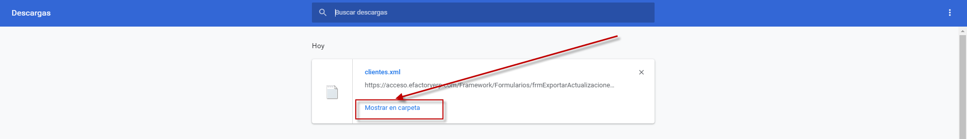 c. Luego podemos observar en la ventana Descargar el documento de Clientes.XML donde presionaremos el botón Mostrar en Carpeta.