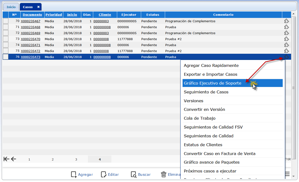 a. En la ventana de Casos, hacer clic en la última columna, la cual muestra para cada registro un ícono, el cual representa los Complementos disponibles.