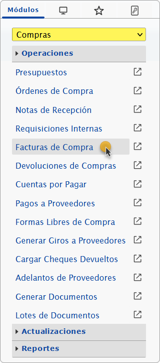 a. Al ingresar en el sistema debemos seleccionar el módulo Compras y al desplegar la sección de Operaciones seleccionaremos la opción de Facturas de Compra.