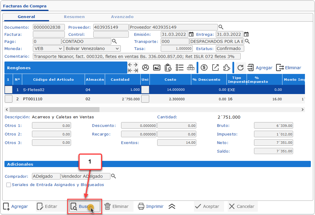 se abrirá la pantalla de Búsqueda: Compras, en esta debemos buscar y seleccionar la factura