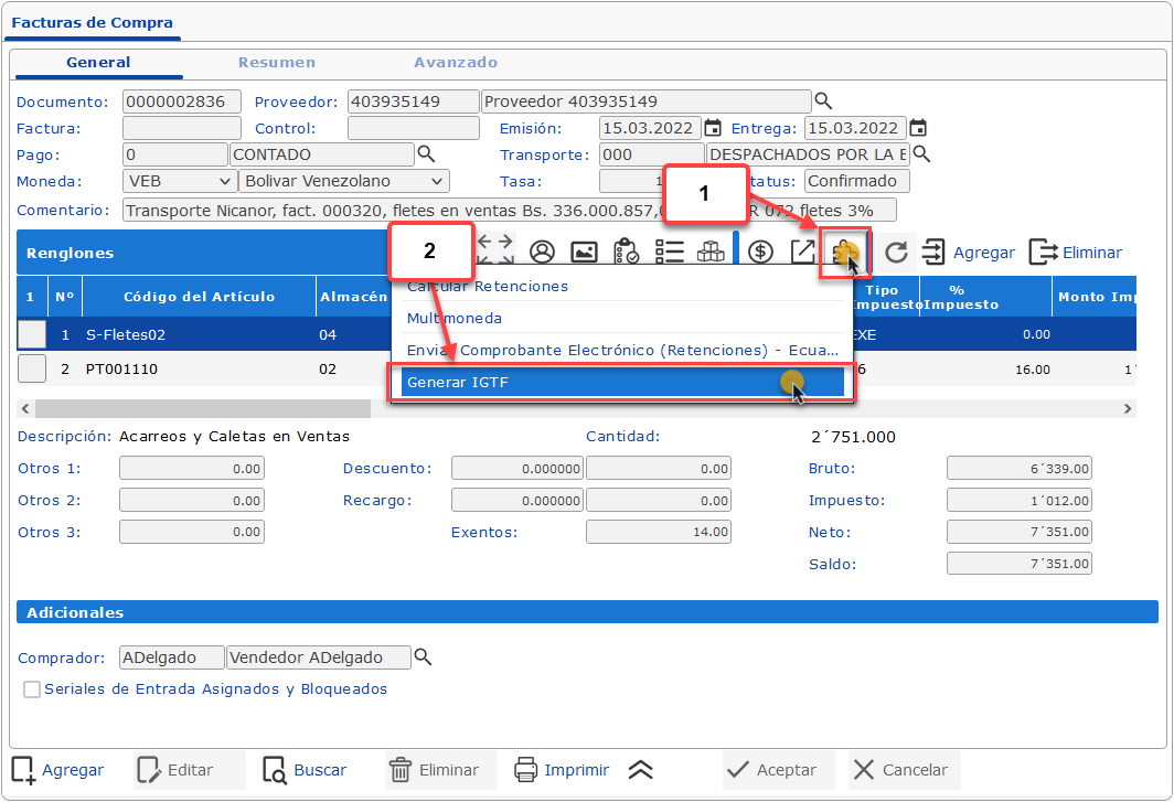 a la que vamos a generar el IGTF y despues debemos hacer clic en el botón