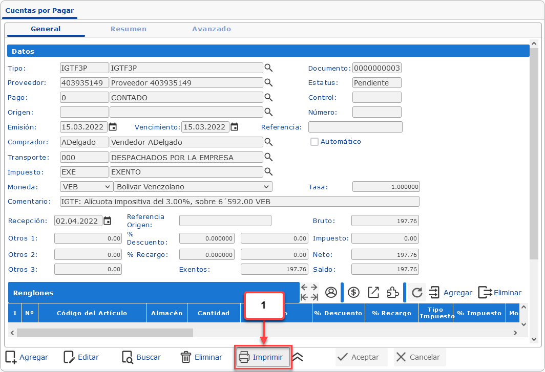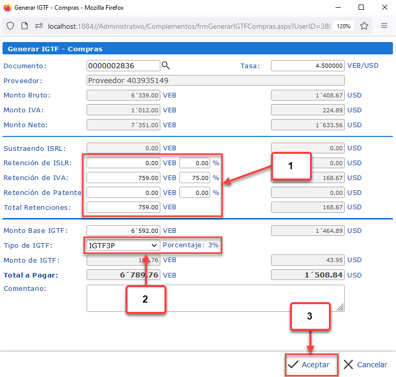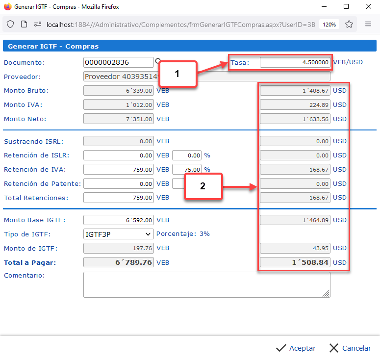 c. Opcionalmente podemos modificar la Tasa con la que se calculan los montos en la otra moneda. Esta tasa se registrará también en la Cuenta por Pagar de IGTF.
