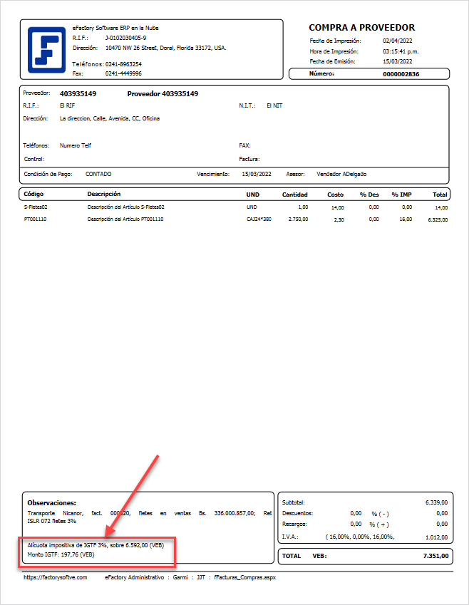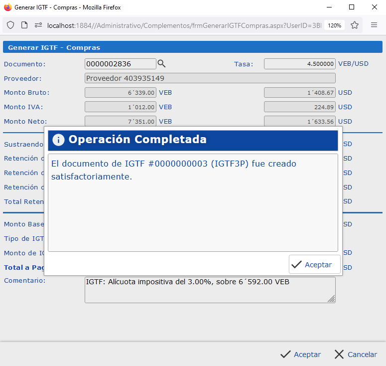 se mostrará el Formato de IGTF, el cual muestra la información del IGTF aplicado.