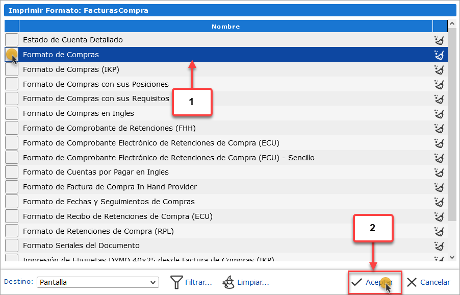 b. Una vez se muestre el listado de formatos de Facturas, debemos seleccionar el formato Formato de Compras y luego presionar el botón