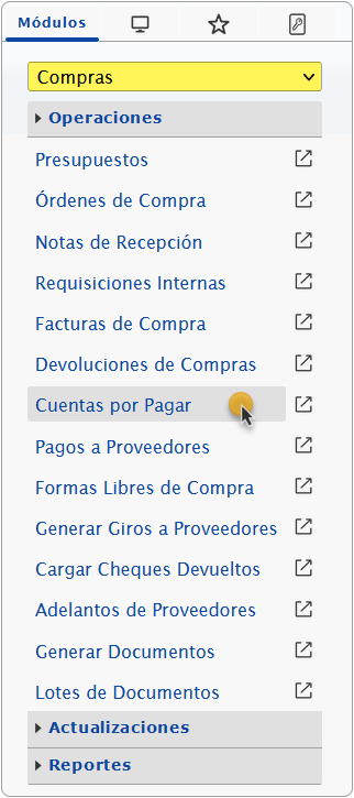 a. Para esto, vamos a ingresar al módulo de Compras y en la sección de Operaciones seleccionaremos la opción de Cuentas por Pagar.