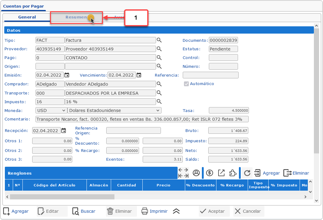b. Una vez se muestre el formulario de Cuentas por Pagar, debemos buscar y seleccionar la Cuenta por Pagar de IGTF. Para esto vamos a hacer clic en la pestaña Resumen.