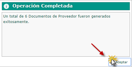 c. Luego podemos observar la ventana donde nos informa que la Operación fue completada exitosamente con un total de documentos de proveedores que fueron generados y seleccionaremos el botón