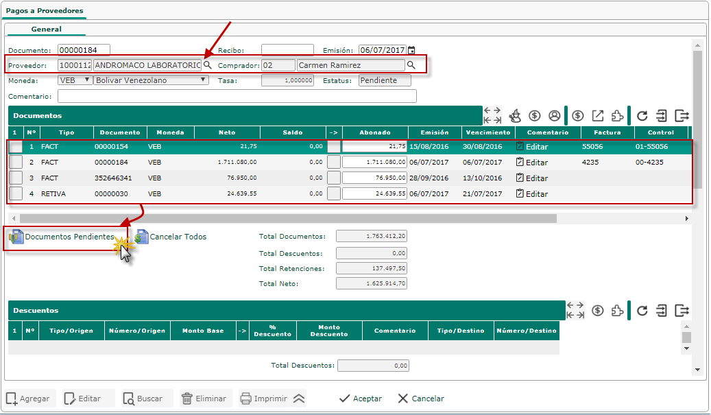 b. Luego procedemos a buscar el proveedor, para obtener sus facturas, después seleccionaremos el botón de