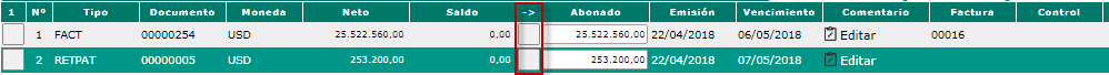 que esta cada factura debajo del ícono "->" donde se abona el monto a pagar de la factura.