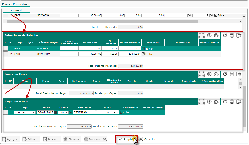 d. Luego sección de patente se puede colocar el porcentaje de cada factura seleccionada y se registra la forma de pago, ya sea por Pagos por Cajas o Pagos por Bancos y seleccionaremos el botón