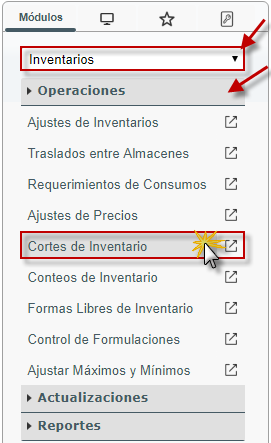 b. En el módulo Inventarios, desplegamos el componente Operaciones y activamos el sub. componente Cortes de Inventario.