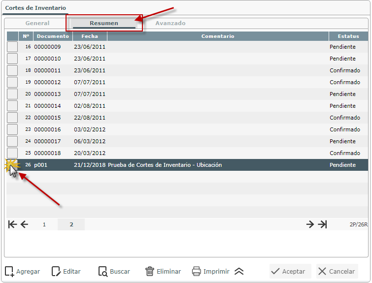 b. Después nos ubicamos en la ficha de Resumen, donde buscaremos el Cortes de Inventario realizado y se procede a seleccionarlo.