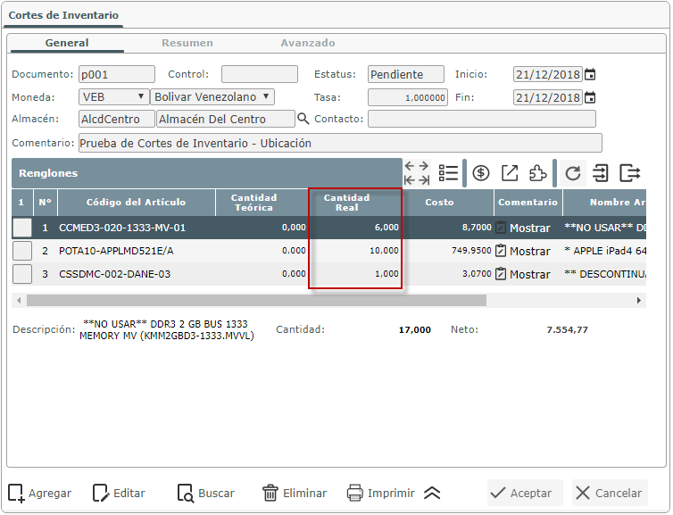 c. Luego se observa el Cortes del Inventario con la Cantidad Real actualizada, después de haber realizado el conteo de existencias por múltiples ubicaciones.