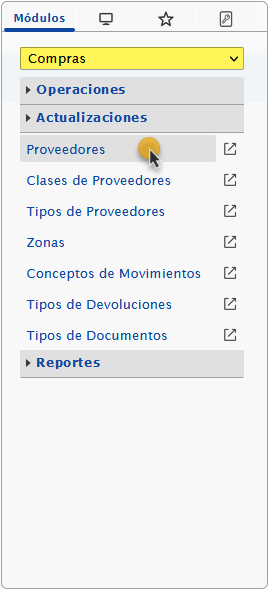 a. Al ingresar en el sistema debemos seleccionar el módulo Compras y al desplegar la sección de Actualizaciones seleccionaremos la opción de Proveedores.