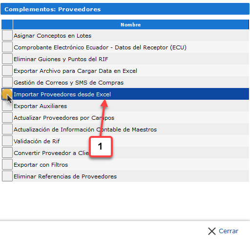 c. Al abrir la pantalla de Complementos: Proveedores, debemos seleccionar la opción Importar Proveedores desde Excel.