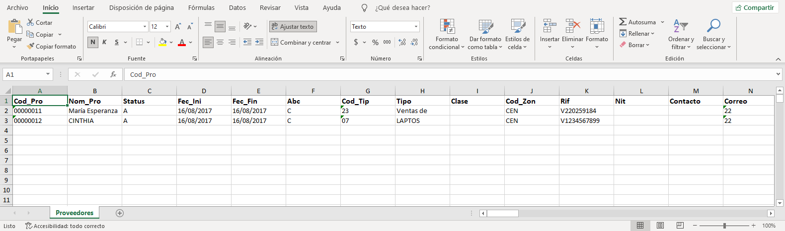 Al presionar el botón Haga clic aquí para descargar la plantilla... se descargará la plantilla Excel, la cual debe llenar con los Proveedores que desea importar o actualizar.