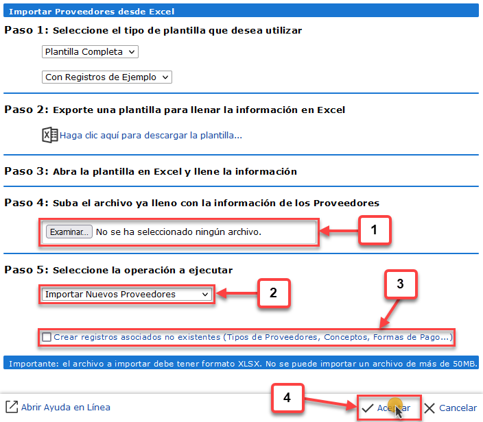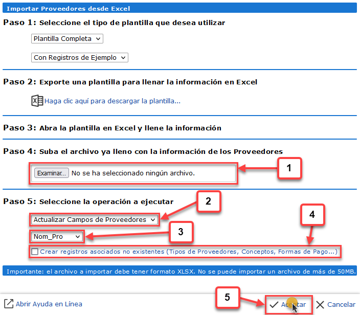 Despues de cargar el archivo Excel con los Proveedores debe subirlo al formulario y luego seleccionar la operación a ejecutar: