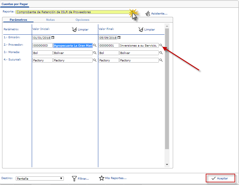 Nota: Para generar el Comprobante de Retención de IVA de un solo Proveedor, debemos especificar dicho Proveedor tanto en la columna Valor Inicial como en Valor Final.
