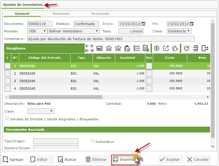 Imprimir Formato: Ajustes Inventarios donde seleccionaremos Formatos de Existencias Actuales y presionaremos el