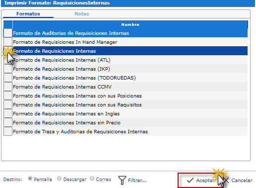 b. En la ventana que se muestra, seleccionamos el item Formato de Requisiciones Internas, especificamos el Destino y presionamos el botón