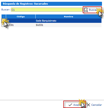 Parámetros, podemos escribir los códigos correspondientes cada campo o también presionar el ícono de lupa