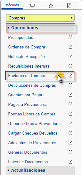 b. En el módulo Compras, desplegamos el componente Operaciones, activamos el sub componente Facturas de Compras