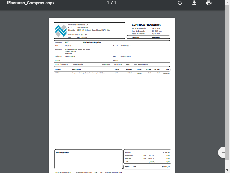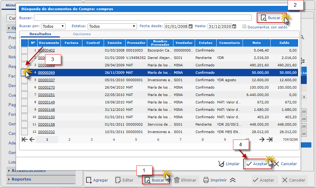 a. Al seleccionar el Sub Componente de Facturas de Compra, se