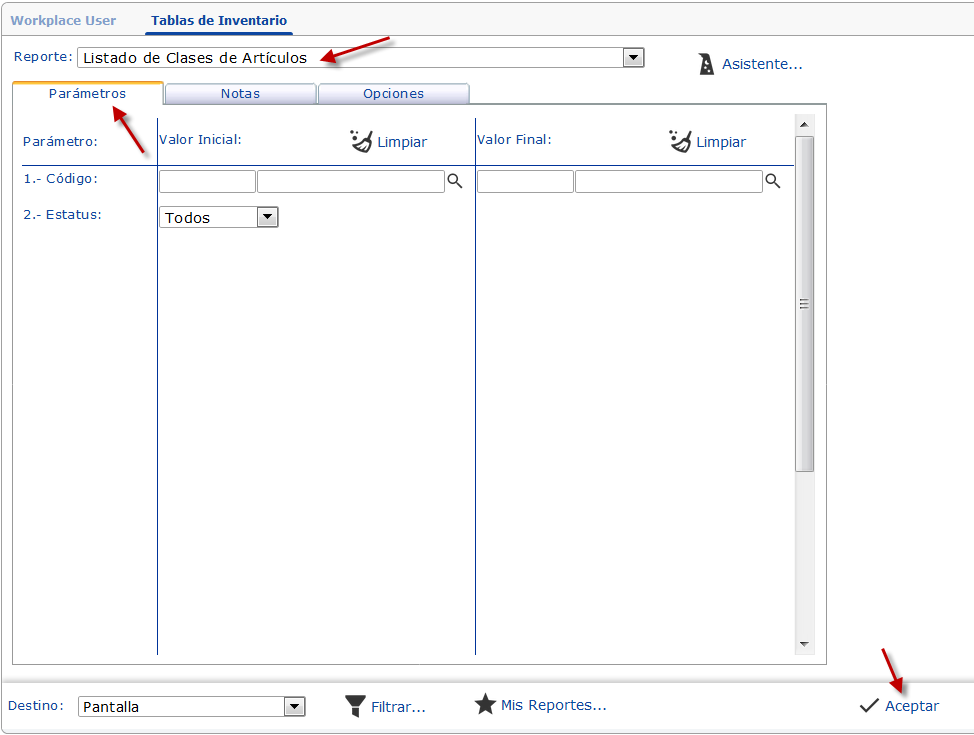 Listado de Clases de Artículos, especificamos los parámetros Código y Estatus, si no queremos filtrar el Reporte, dejamos los valores predeterminados.