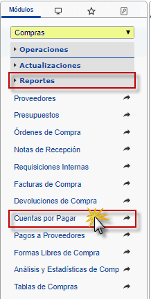 b. En el módulo Compras, desplegamos el componente Reportes, activamos el sub componente Cuentas por Pagar.