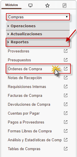 b. En el módulo Compras, desplegamos el componente Reportes y presionaremos el sub componetes Órdenes de Compra.