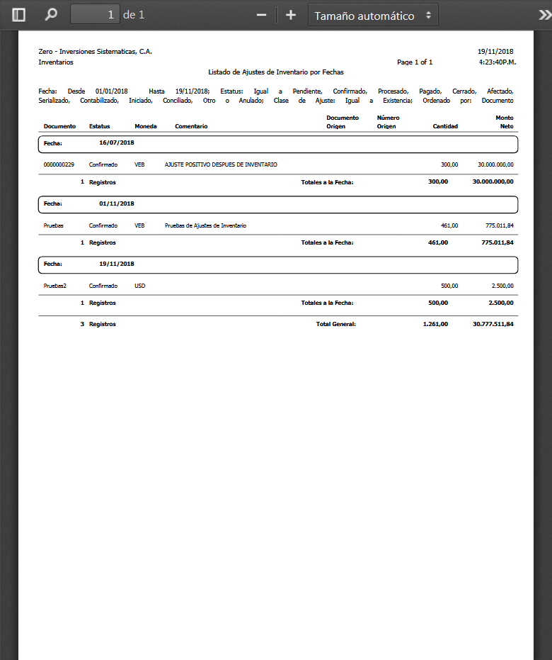 b. Luego de presionar aceptar automaticamente se nos desplegara el reporte el cual contendra un listado detallado de los ajustes de inventarios hechos en dicha empresa agrupado por fecha.