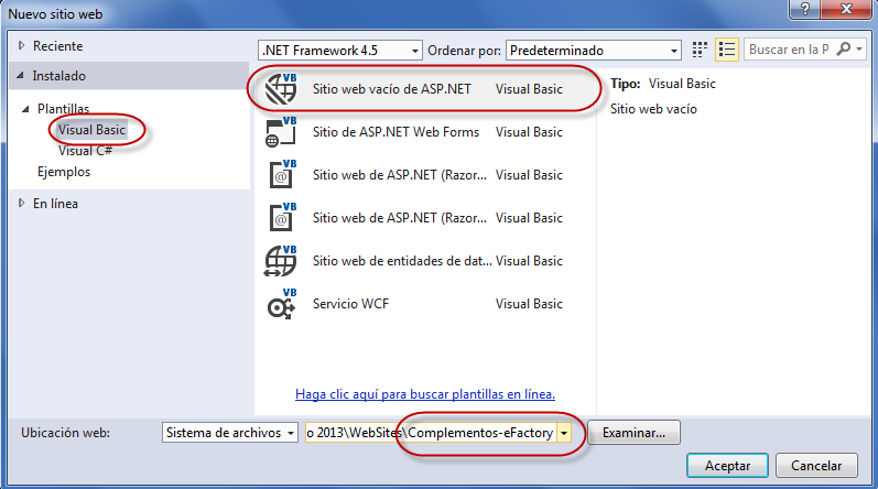 Los complementos de eFactory están programados con ASP.NET + Visual Basic, con el .NET Framework 3.0.